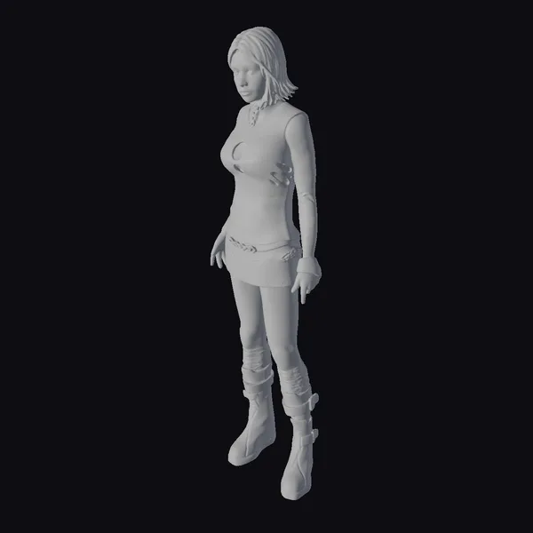 Detailed with precision, this stylized female figure boasts a rich, dark red hair and piercing gaze, donning a crimson and black striped long-sleeve shirt with cutouts, a short black skirt, and black knee-high boots with maroon socks. Her confident stance, with one arm crossed over her chest and the other by her side, accentuates her bold and edgy style. The figure’s proportions are well-balanced, with detailed textures and lighting that enhance her overall appearance. Ideal for use in various projects such as games, animations, virtual reality experiences, and designs where a stylized, modern character is needed.