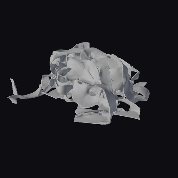 In a mesmerizing display of texture and form, a large ball of crinkled white paper strips dominates the space, each one uniquely torn and twisted. The lighting accentuates the depth of the folds and creases, creating a sense of volume and dimensionality. The base of the ball appears more compact, with strips tightly wrapped, while the top is loose and disheveled, with strips extending outward in various directions. This model is perfect for adding a realistic touch to 3D scenes, whether for animation, games, or architectural visualizations. Its high level of detail and texture makes it suitable for close-up shots or as a background element.