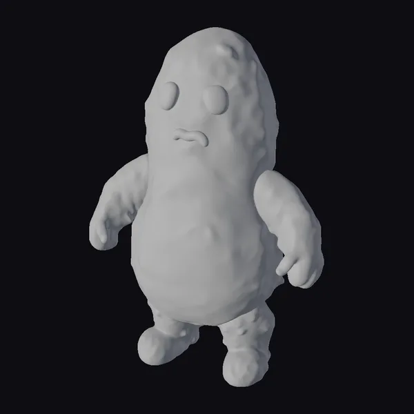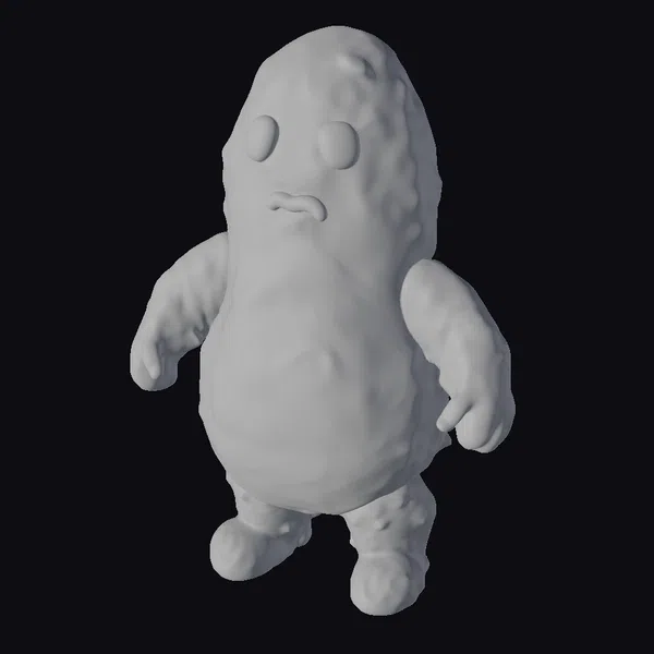 Gazing at the Crispy Spud Monster, its bulbous body seems to radiate a warm, inviting glow. The model’s surface texture mimics the crispy exterior of a roasted potato, complete with tiny bumps and crevices that catch the light. Two large, round eyes made of a glossy, dark material peer out from the top of the creature’s head, while a small, downturned mouth adds a hint of mischief to its expression. Standing on two stumpy legs, the Spud Monster exudes a playful, endearing presence that’s perfect for a variety of creative projects, from animations and games to 3D printing and design. Its unique blend of fantasy and culinary inspiration makes it a standout addition to any collection.