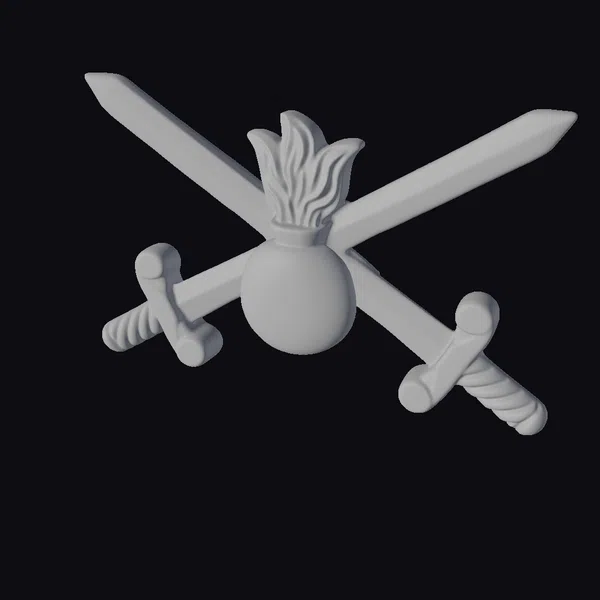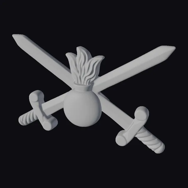 In a stunning display of military symbolism, this 3D model showcases a gold badge with two crossed swords and a central grenade motif. The swords, with their detailed hilts and blades, are positioned in a dynamic crisscross pattern. The grenade, adorned with flames, sits prominently at the center. Crafted with precision, this model highlights a shiny metallic texture, perfect for use in games, 3D printing, VR/AR experiences, animations, or design projects. Its realistic style and attention to detail make it a compelling addition to any project.