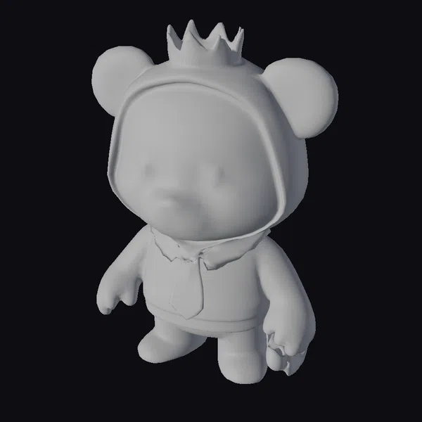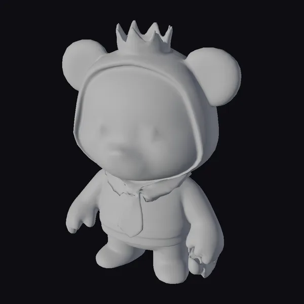 Standing proudly with a gentle smile, this crowned bear is meticulously detailed with a textured fur effect, bright and cheerful colors, and an endearing expression. The orange hood with a blue and gold crown on top adds a regal touch, while the blue vest and orange tie bring a sense of casual elegance. The bear’s pose, with one hand holding an orange object, suggests a story waiting to be told. Ideal for use in children’s book illustrations, game characters, or as a unique decorative piece, this model brings a sense of joy and fantasy to any scene. Its stylized features make it versatile for various creative projects, from animation to 3D printing.