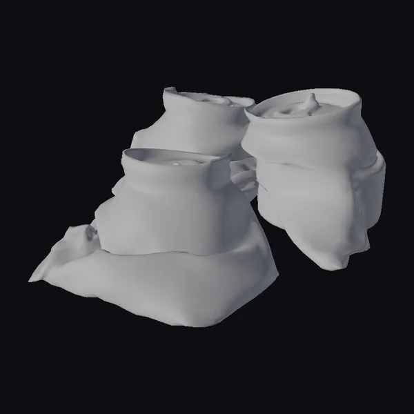In a tangled heap, three soda cans lay crushed and discarded, their once-pristine surfaces now distorted and shiny. The can in the foreground boasts a mesmerizing mosaic of red, blue, green, and yellow, its metal gleaming with a subtle sheen. As light dances across their deformed bodies, highlights accentuate the creases and crumpled textures, infusing the scene with an air of urban neglect. Ideal for adding a dash of realism or stylized flair to games, 3D prints, VR/AR experiences, animations, or design projects, these crushed cans bring an undeniable edge to your creative vision.