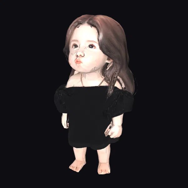 This detailed 3D model depicts a little girl in a poignant moment of sadness. Her long brown hair cascades down her back, framing her round face where tears are visibly streaming down her cheeks. She wears a black off-the-shoulder dress that is slightly loose, hanging off her shoulders, and she stands barefoot. The model captures a range of emotions through its detailed facial expression and body language, making it suitable for various applications such as animation, game development, and visual effects. The stylized cartoonish approach gives the model a unique charm, making it stand out in any project.