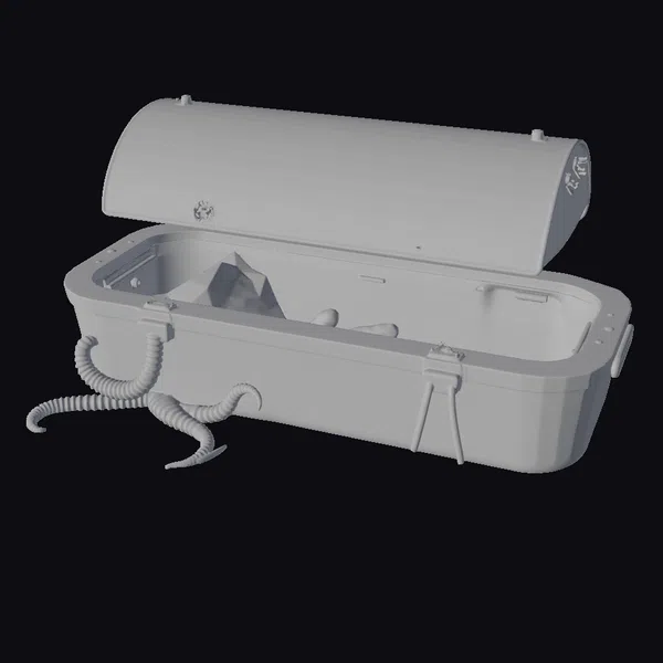 Positioned dramatically with its lid ajar, the cryo coffin pod showcases a radiant, blue-lit interior, complete with a frozen figure and an unsettling, dark tentacle wrapped around its exterior. The pod’s design combines sleek, futuristic lines with a rugged, deep-sea aesthetic, suggesting a recovery from an underwater abyss. Textures of thick glass or similar materials give the pod a robust appearance, while the glowing blue light emanates an ethereal glow. This model is perfect for use in games, 3D printing, VR/AR experiences, animation projects, and design visualizations, offering a unique blend of sci-fi and dark fantasy elements.