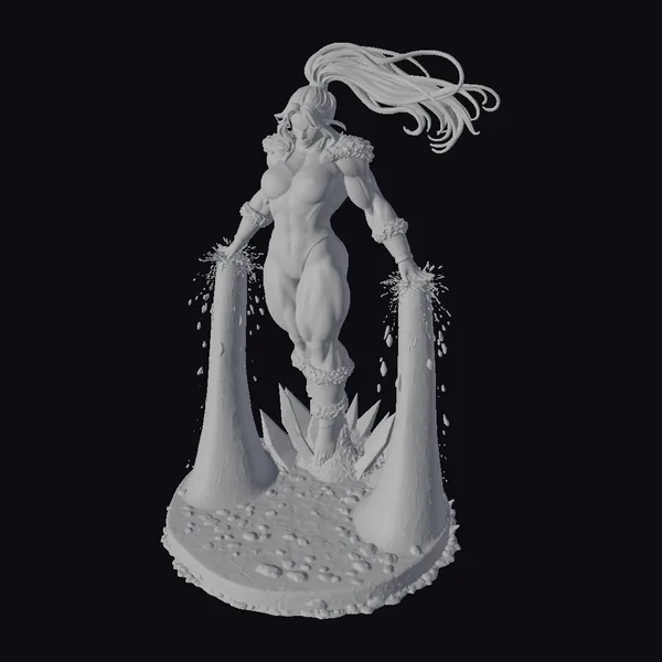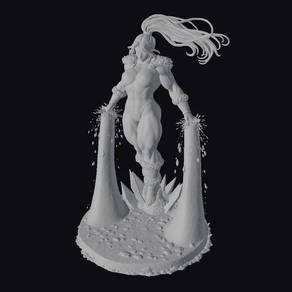 This striking figure stands tall, her long white hair flowing like the icy tendrils that surround her. Her black and white costume is accentuated with fur trim, adding a touch of elegance to her powerful build. The glowing blue ice at her sides seems to pulse with an otherworldly energy, as if it’s an extension of her own powers. Her facial features are strong, with a determined look that commands attention. The stylized artwork brings a sense of fantasy and dynamism to the character, making her a compelling addition to any project. Whether you’re working on a game, animation, or design, this cryo warrior woman is sure to make an impact.