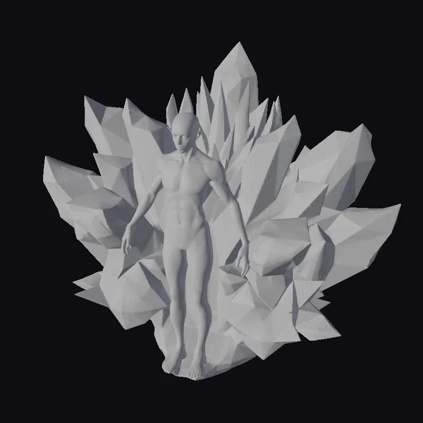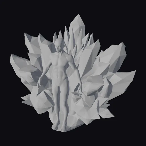 At the heart of this mesmerizing crystal formation lies a humanoid figure, bathed in a kaleidoscope of purple and cyan hues. The crystal’s jagged, shard-like protrusions seem to defy gravity, as if frozen in a moment of dynamic movement. The low-poly aesthetic lends a stylized, video game-inspired quality, while the digital glitch effects imbue the piece with a sense of technological experimentation. As a 3D model, this crystal energy formation is poised to electrify your games, animations, or VR/AR experiences with its unique blend of mysticism and futurism. Designers and artists can leverage its striking appearance to craft compelling narratives or simply add a touch of sci-fi wonder to their projects.