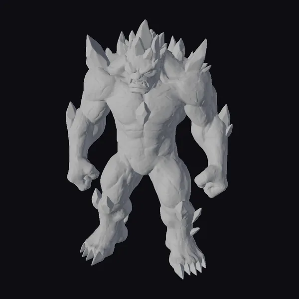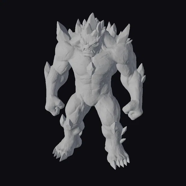 This imposing figure stands ready for battle, its body a blend of organic and crystalline structures. The dark gray skin appears almost metallic, with deep blue crystal veins snaking across its surface. Sharp, glowing blue crystals jut out from its shoulders, arms, and legs, casting an eerie light on the surroundings. The golem’s facial features are chiseled and intense, with a stern expression that conveys a sense of unyielding power. As it stands with fists clenched and feet shoulder-width apart, it seems poised to shatter any obstacle in its path. Bring this fearsome creature to life in your projects, whether for games, animation, or 3D printing.