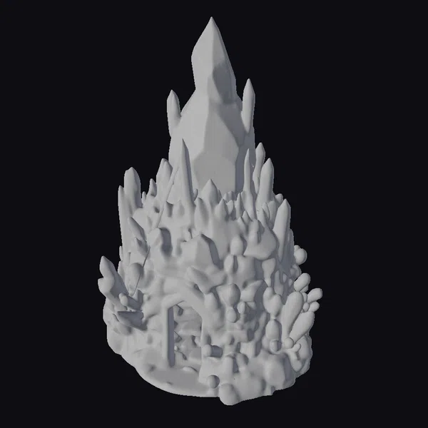 Perched atop a rugged base, the Crystal Hermit Home rises with a series of jagged, crystal formations that evoke a sense of ancient, mystical power. The entrance, small and archway-like, invites curiosity, while the multitude of crystalline protrusions, varying in size and shape, create a textured, almost organic appearance. The glassy texture of the crystals reflects light, imbuing the structure with a sense of ethereal beauty. Ideal for use in fantasy games, animations, or architectural designs seeking a touch of the extraordinary, this model promises to add depth and intrigue to any project. Its detailed, rocky facade and soaring spires make it a compelling addition to any 3D environment.