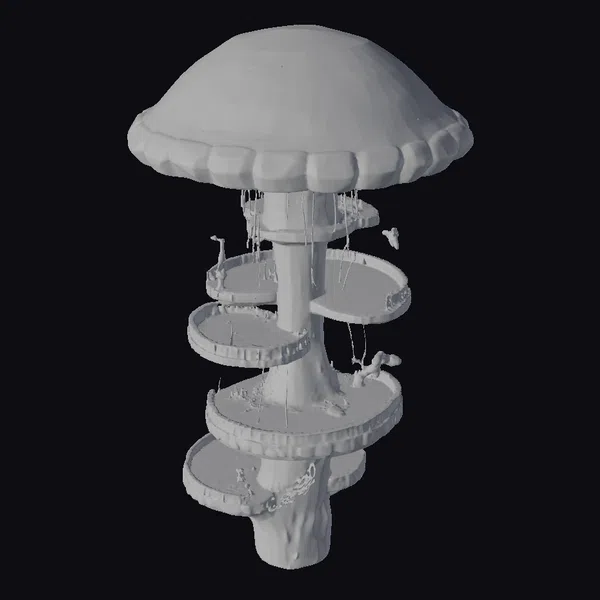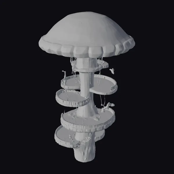 Perched atop a slender, crystal column, the pavilion’s dome showcases a mesmerizing blend of blue and purple hues, reminiscent of a moon-jelly’s ethereal glow. As sunlight filters through, it casts a kaleidoscope of colors across the surrounding environment, creating an otherworldly ambiance. The spiral platforms, adorned with tiny, intricate details, appear to defy gravity as they wind their way down the central column. This model is perfect for those seeking to add a touch of fantasy and wonder to their 3D projects, whether for games, animation, VR/AR experiences, or architectural visualizations.