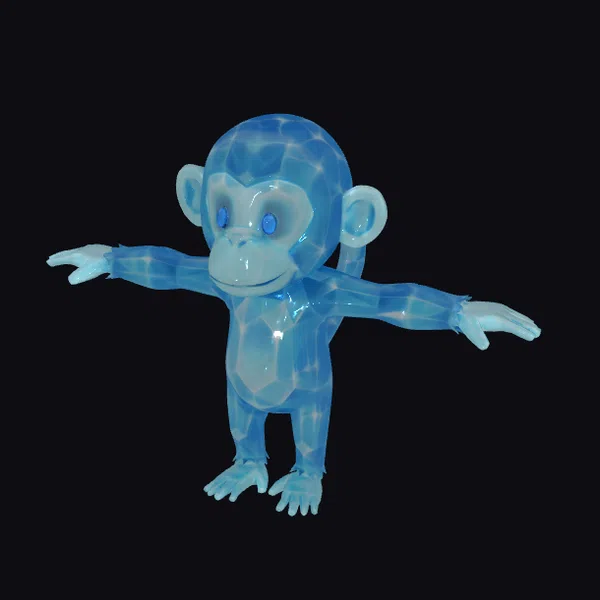 Standing with its arms outstretched in a playful gesture, this crystal primate boasts a mesmerizing blue hue that seems to glow from within. The model’s stylized features, including its smooth, rounded body and simplified facial structure, contribute to its endearing and whimsical appearance. The transparent, glossy material adds depth and a sense of realism, making the primate seem like a living, breathing creature. Its pose suggests movement and energy, as if it’s about to leap into action. This model would be perfect for use in games, animations, or as a decorative piece, bringing a touch of fantasy and fun to any project or space.