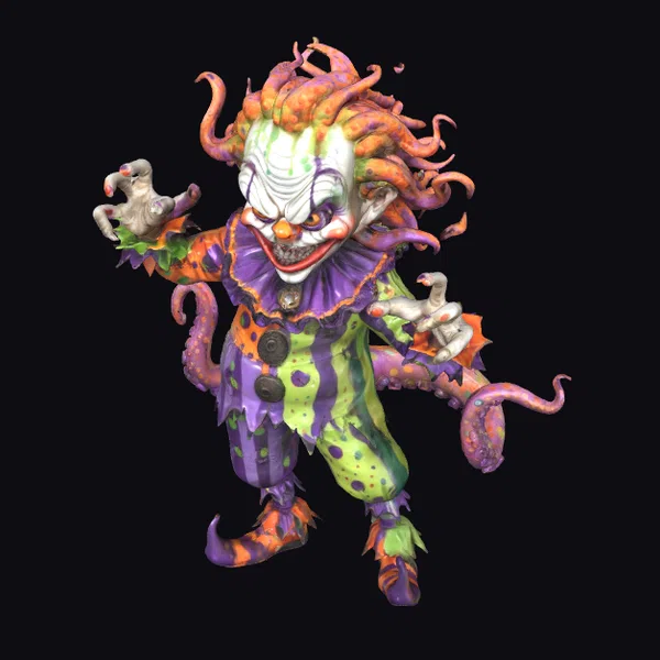 Floating dynamically against a stark white background, this Cthulhu horror clown model showcases intricate details and textures. The character’s pose, with arms outstretched and tentacles curled, exudes a sense of playful menace. The stylized design features a predominantly orange and green color scheme with accents of purple and white, creating a visually striking effect. The clown’s face, with its exaggerated features and glowing orange eye, adds to the overall sense of unease. This model is ideal for use in games, 3D printing, VR/AR experiences, animation, and design projects, particularly those with a dark or fantastical theme.