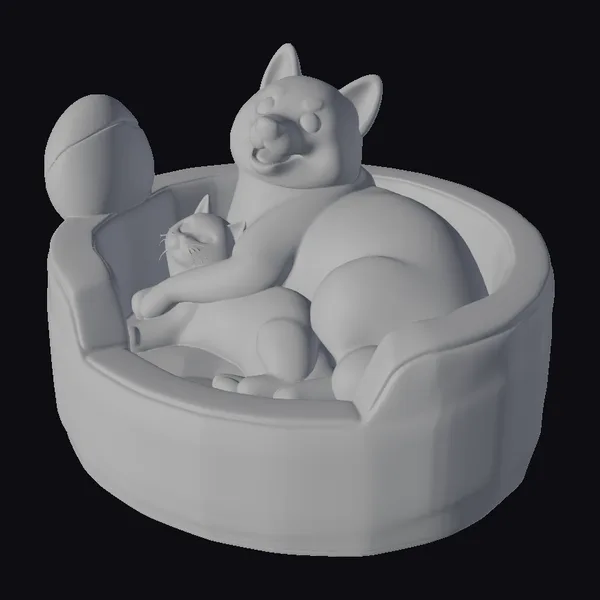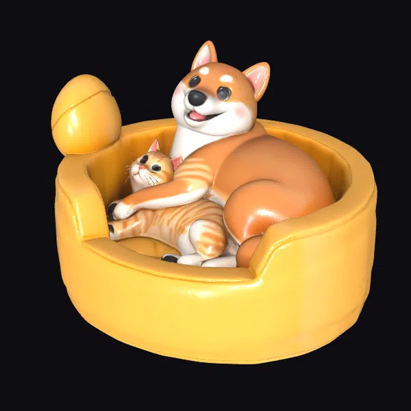 Detailed with precision, this charming scene showcases a dog and a cat cozied up together in a bright yellow-peach colored chair, both featuring cartoon-style characteristics. The dog, with its cheerful expression and pink blushes on its cheeks, wraps its body protectively around the cat, which lies relaxed and content. The chair, designed to look like a cozy nook, complete with a spherical pillow on the side, adds to the intimate and warm atmosphere. Textures are smooth, with subtle hints of shine, suggesting a glossy finish. This model is perfect for projects requiring a heartwarming, playful vibe, suitable for animations, games, or even virtual reality experiences.