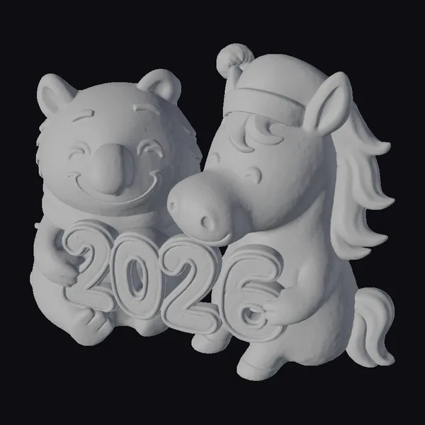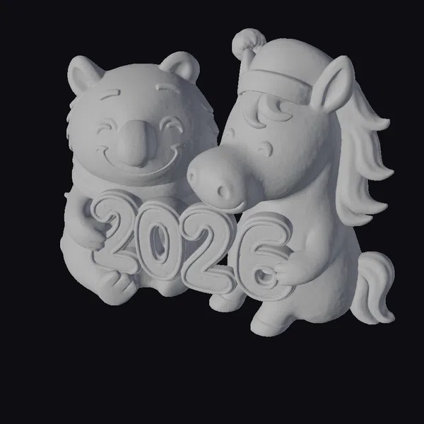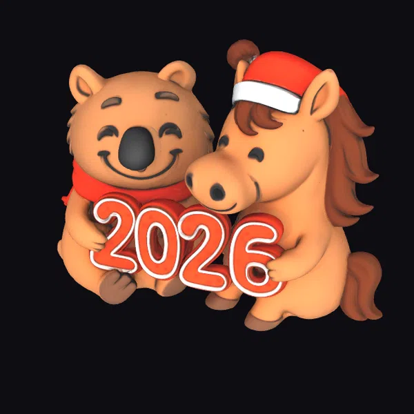 In a delightful display of companionship, a koala and a horse are captured in a tender moment, with the year ‘2026’ prominently displayed between them. The koala, adorned with a vibrant red scarf, sports a cheerful smile and closed eyes, while the horse, wearing a red hat with a white trim, gazes affectionately at its companion. The duo’s playful and friendly demeanor makes them perfect for various creative projects, such as animations, games, or print materials. Their cartoonish style and bright colors ensure they will capture the hearts of audiences of all ages.