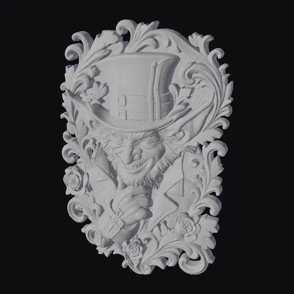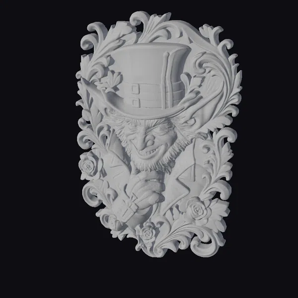 This intricately carved wooden relief features a leprechaun with a mischievous grin, peeking out from under the brim of his classic top hat. The leprechaun’s face is rendered in warm, golden hues, with a distinctive rosy beard and hair that adds a pop of color to the otherwise earthy tones of the design. The ornate frame is adorned with delicate leaves and vibrant red roses, expertly woven into the curved wooden structure. The level of detail is exceptional, making this model perfect for use in games, 3D printing, VR/AR experiences, animation, and design projects. The stylized, fantastical nature of the leprechaun’s depiction adds a touch of magic to any scene.
