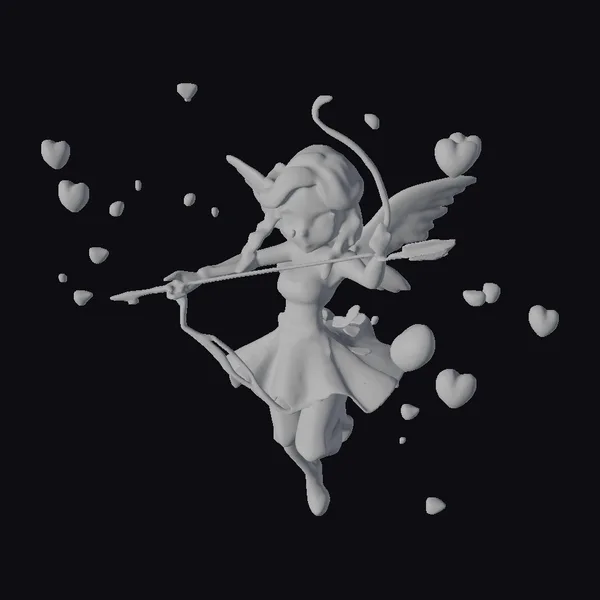 Detailed in every aspect, this stylized cupid model showcases a young woman with a fitness-oriented physique and a notably curvaceous figure. Her long, flowing braids and tiny horns add to her mythical allure, while the bow and arrow in her hands are poised for action, surrounded by a flurry of hearts that enhance the romantic ambiance. The model’s playful stance and the dynamic movement of her wings and clothing create a lively scene. Textured with attention to detail, the model boasts vivid colors and a high level of detail, making it perfect for projects requiring a touch of fantasy and romance, such as animations, games, or Valentine’s Day-themed designs.
