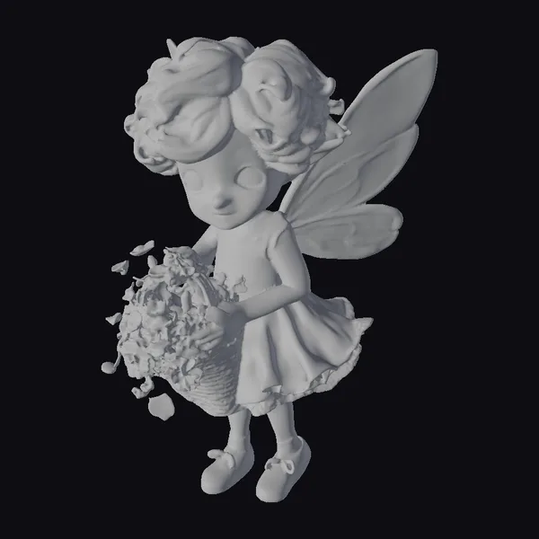 In a pose that exudes gentle charm, this stylized fairy figuratively embodies the essence of fantasy. Her curly hair, a frothy concoction of pink and peach tones, contrasts beautifully with her pristine white dress and translucent wings. The basket of flowers she holds is a riot of color, with pink, purple, and yellow blooms spilling out. The intricate details, from the texture of her dress to the delicate petals, make this model perfect for projects requiring a touch of magic, such as animations, games, or fantasy-themed designs.