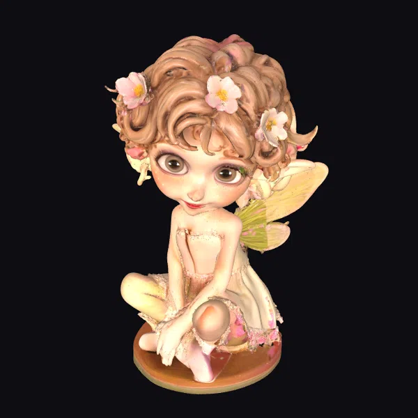 This captivating fairy figurine showcases intricate details, from the soft, curly texture of her hair to the gentle sheen on her wings. The fairy’s pose, sitting gracefully with a basket of flowers, exudes a sense of serenity. Her large, expressive eyes and subtle smile invite the viewer into a world of fantasy. This model is perfect for enhancing games, animations, or virtual reality experiences with a touch of magic. Its stylized features make it an excellent choice for designers seeking a charming, cartoon-like character.