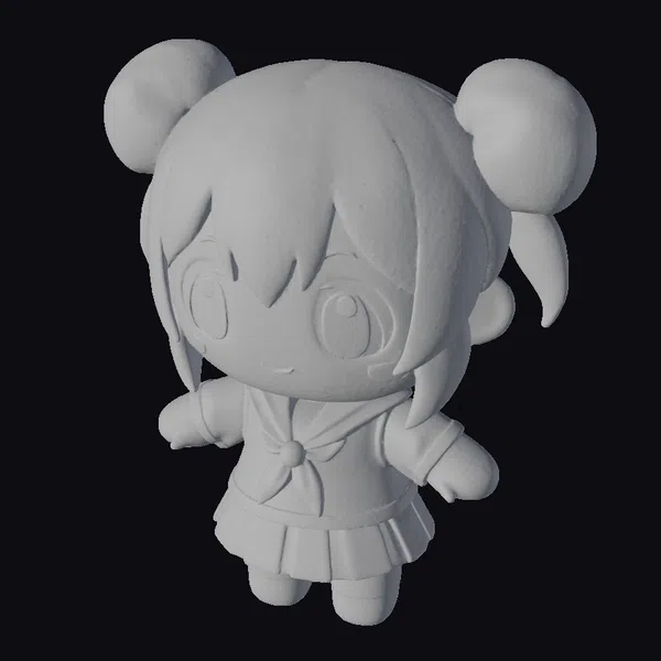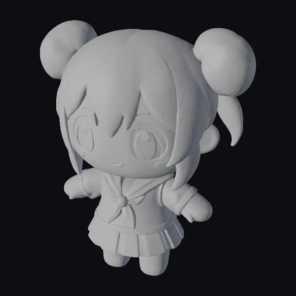 Detailed with precision, this adorable anime girl plush toy boasts a cheerful demeanor, characterized by her large, expressive brown eyes and rosy cheeks. Her blonde hair is styled in two endearing buns on top of her head, complementing her white and navy blue sailor-style outfit adorned with a striking red bow at the chest. The model showcases a blend of soft, rounded features and intricate details, making it perfect for various applications including game development, animation projects, and 3D printing. Its cute and inviting appearance is sure to captivate audiences across different platforms.