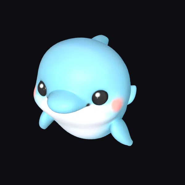 Imagine a charming, light blue dolphin with a joyful smile and big, shiny eyes. This adorable creature features a rounded body, small fins, and rosy cheeks, exuding a sense of playfulness and friendliness. Its smooth, glossy texture and vibrant color make it a delightful addition to any scene.