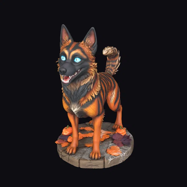 The ultra-realistic Belgian Malinois dog model stands proudly on a circular stone base, adorned with scattered orange leaves and small pumpkins that add a pop of color and festive spirit. The dog’s fur is rendered in exquisite detail, with a mix of orange, black, and white hues that mimic the breed’s distinctive coat. Its eyes are a striking blue, filled with a playful intensity that seems to invite interaction. The model’s pose, with its ears perked up and tail curled, captures a moment of dynamic movement, as if it’s about to spring into action. This level of detail and realism makes the model perfect for use in games, 3D printing, virtual reality (VR) and augmented reality (AR) experiences, animations, and design projects where a high-quality, cute, and realistic dog character is needed.