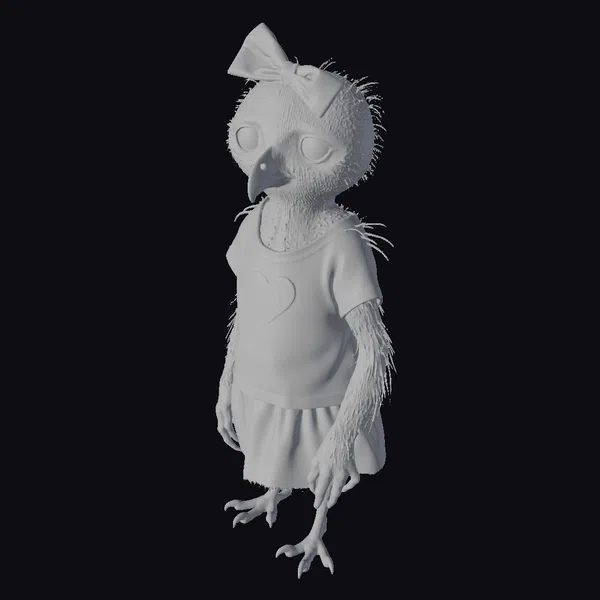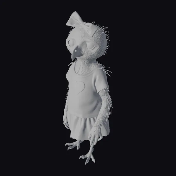 This endearing bird girl stands out with her unique blend of avian and human features. Her large, expressive eyes and soft, furry texture give her a distinctly stylized look. She wears a pink bow on her head and a pink shirt with a heart, paired with a dark gray skirt. Her pose is relaxed, with one leg slightly bent, giving her a playful and approachable vibe. The intricate details, from her feathered arms to her sharp claws, showcase a high level of craftsmanship. This model is perfect for projects that require a touch of fantasy and charm, such as animations, games, or VR experiences.
