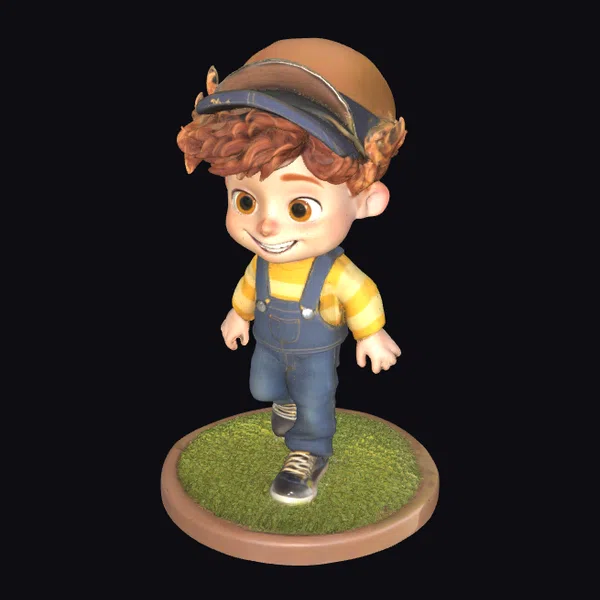 Detailed from head to toe, this stylized cartoon character boasts an endearing appearance. His curly brown hair peeks out from under a brown hat adorned with a blue band. The boy’s big, expressive brown eyes sparkle with excitement as he strides forward. His outfit consists of yellow and white striped shirt, blue overalls with silver buttons, and black shoes with yellow laces. Positioned on a round base covered in vibrant green grass, the model showcases meticulous attention to detail. Ideal for use in animations, games, VR/AR experiences, and print projects, this character model brings a lively atmosphere to any creative endeavor.