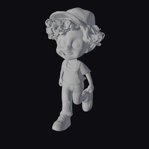 This delightful 3D character model depicts a young boy with a dynamic walking pose, showcasing his curly red hair peeking out from under a tan hat. His bright yellow shirt and blue overalls create a vibrant contrast, while his big, expressive brown eyes and wide smile convey a sense of joy and confidence. The model’s stylized cartoon proportions and soft textures bring a sense of warmth and approachability. Perfect for animation, games, or print projects, this character can be used to add a touch of whimsy and friendliness. His detailed features, from the stitching on his overalls to the laces on his sneakers, make him a versatile asset for various creative endeavors.
