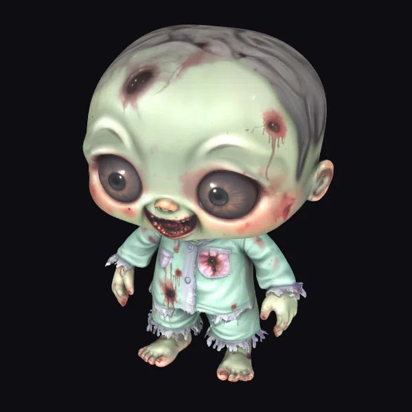 Gaze into the adorable yet unsettling world of this cartoon zombie baby, with its oversized head, wide vacant eyes, and a mischievous grin revealing tiny teeth. The baby’s pale green skin is speckled with dark wounds and bloodshot eyes, adding a touch of eeriness to its otherwise cute appearance.