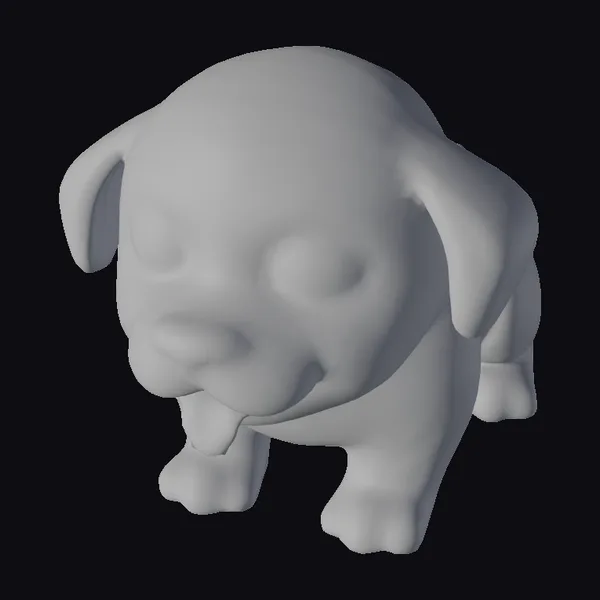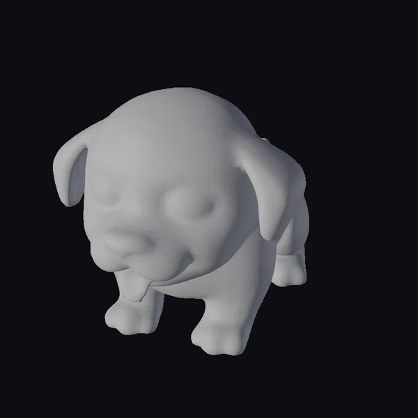 Gazing directly at you with big, round eyes, this puppy’s head and upper body are rendered in a delightful, stylized manner. The fur is predominantly white with brown patches around the eyes and ears, giving it a sweet and endearing appearance. The large, dark eyes sparkle with curiosity, while the tiny pink tongue adds a touch of playfulness. This model is perfect for projects requiring a lovable, cartoonish canine character, such as animations, games, or children’s content. Its stylized features make it versatile for various creative applications.