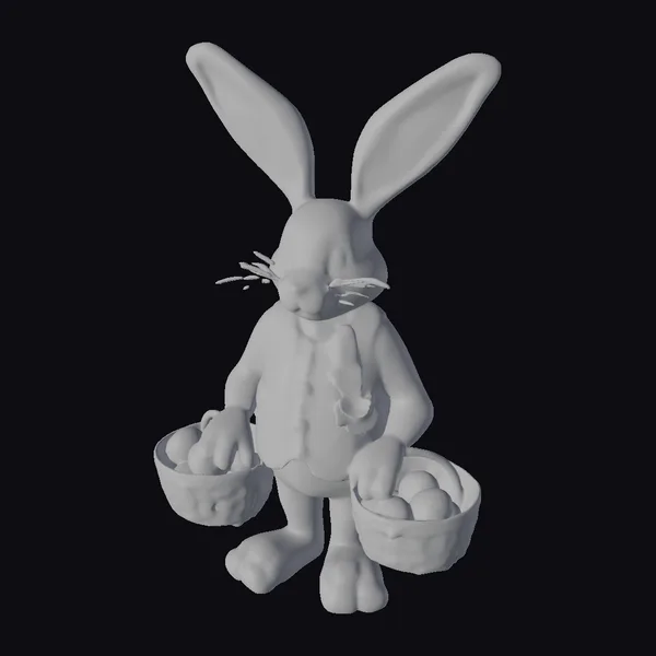 Standing proudly with an endearing smile, this stylized Easter bunny showcases meticulous attention to detail. Its pose, with one hand resting on its hip and the other gently holding a basket, conveys a sense of casual elegance. The bunny’s fur is rendered in soft, white hues with subtle texture, while its ears and nose boast a delicate pink. Two intricately designed baskets, adorned with pastel flowers, hang from its hands, each filled with an assortment of brightly colored eggs that add a pop of color. The model’s intricate details make it perfect for use in animations, games, VR/AR experiences, and Easter-themed designs.