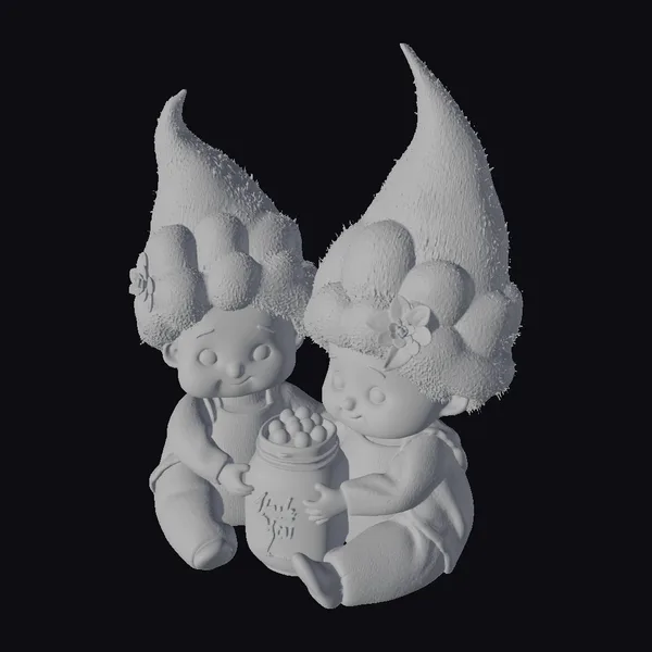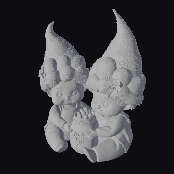 Delicately posed in a sitting position, this charming duo of elf children exude a sense of innocence and playfulness. Their large, stylish hairdos are accentuated with tiny flowers, adding a touch of elegance to their whimsical appearance. The intricate details of their knitwear and the textured jar of treats they’re sharing are meticulously rendered, inviting the viewer into a world of fantasy and delight. The soft pastel color palette enhances the model’s appeal, making it perfect for projects requiring a touch of magic and wonder, such as animation, game design, or collectible figurines.