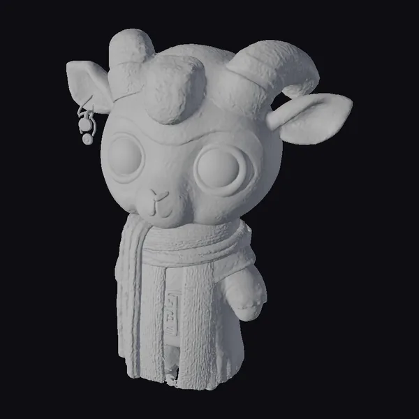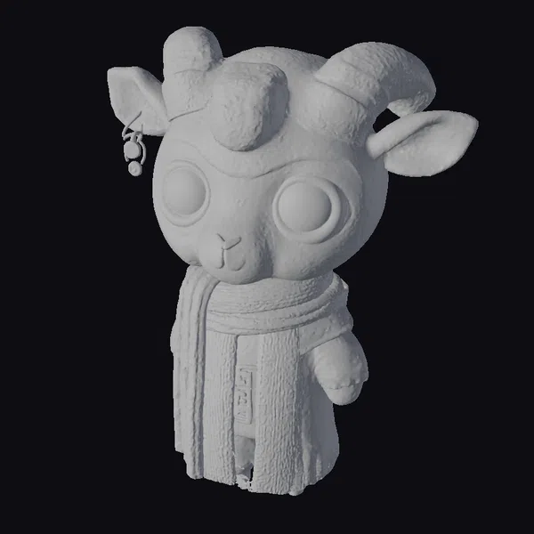 Positioned in a gentle, forward-facing pose, this stylized goat figurine showcases intricate details such as textured scarf folds, a dangling earring, and a soft, blended color scheme that transitions smoothly from creamy whites to warm oranges. The large, expressive eyes are accentuated with bright blue outlines, adding to the character’s allure. Ideal for use in animation, games, or as a decorative piece, this model brings a touch of lightheartedness and fantasy to any project or setting.
