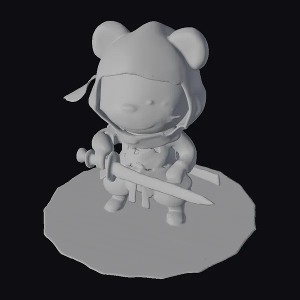 Detailed with precision, this stylized panda ninja model boasts a teal hood with a red tassel, a red scarf wrapped around its neck, and a dark green outfit. The panda’s large, expressive eyes and rosy cheeks add to its cute and determined appearance. Holding a sword in a battle-ready stance, the model is set against a rustic, earthy base. Ideal for games, animation, or design projects, this model brings a touch of whimsy and adventure. Its high-definition, illustrative look makes it perfect for projects requiring a unique, stylized character.