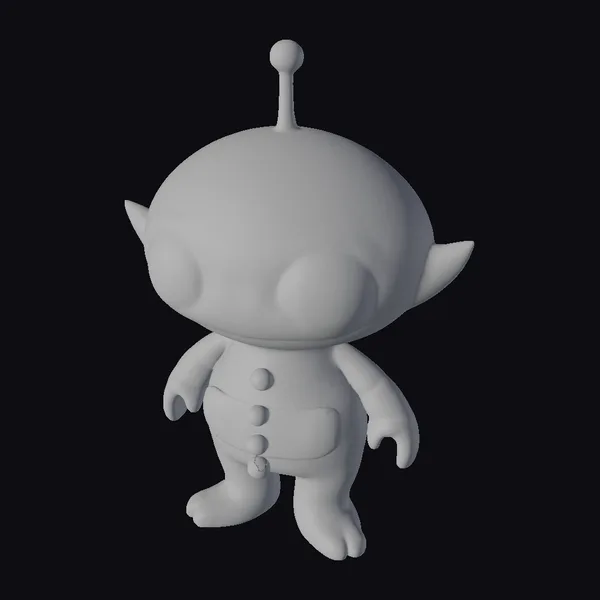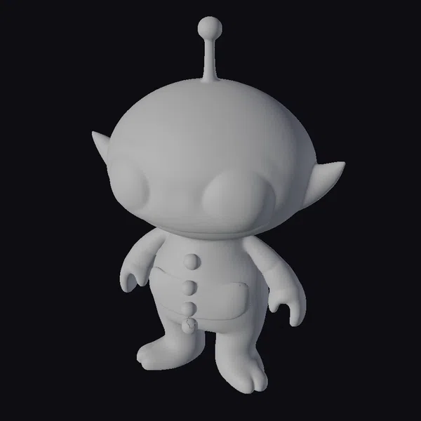 Standing proudly with a slight lean to one side, this adorable alien toy figure boasts a vibrant yellow body with a smooth, glossy finish. Its large, black eyes are framed by small, rounded ears, giving it an irresistibly cute appearance. A small antenna protrudes from the top of its head, adding to its extraterrestrial charm. The toy’s body features a white diaper-like section adorned with small, colorful stars and planets, along with three orange buttons down the center. Its short arms are held slightly away from its body, as if ready to embrace or gesture in a friendly manner. This model is ideal for use in children’s projects, educational materials, or any creative endeavor requiring a friendly alien character. Its detailed design and bright colors make it a versatile asset for 3D modeling, animation, and game development.