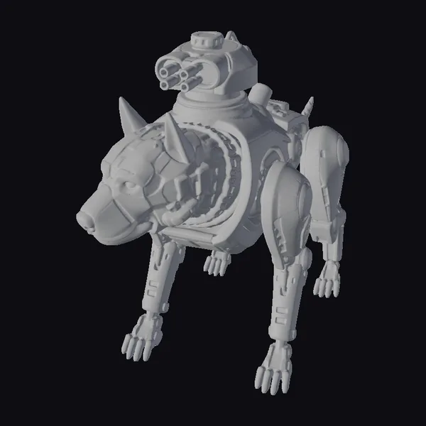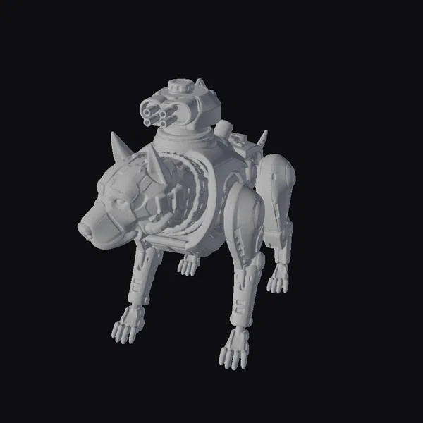 Standing proudly with its legs spread wide, this robotic dog exudes a sense of futuristic power. The model’s body is a masterful blend of dog-like features and cybernetic enhancements, with visible mechanical components and wiring under its metallic yellow skin. The head is shaped like a dog’s, complete with pointed ears and a snout, but its eyes burn with an eerie red glow. A distinctive turret on top of the head, equipped with what appears to be targeting optics, adds to the sci-fi aesthetic. This model is perfect for projects requiring a futuristic, high-tech creature, such as games, animations, or virtual reality experiences.