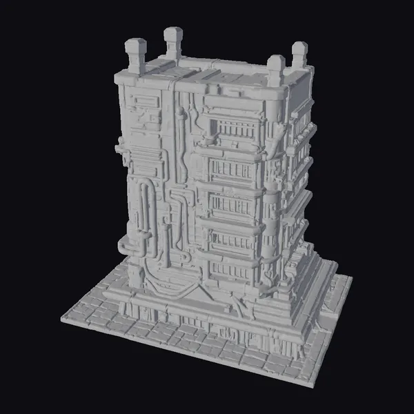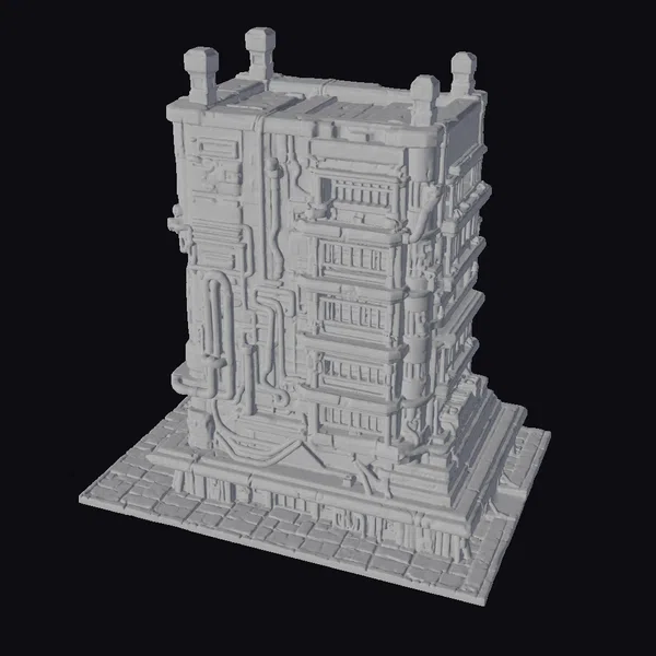 Gaze up at the imposing Cyber Fortress Tower, its dark metallic facade punctuated by rows of glowing orange windows. The tower’s industrial design and cyberpunk aesthetic evoke a sense of high-tech surveillance and control. With its intricate details and rugged texture, this model is perfect for adding a touch of sci-fi sophistication to any project.