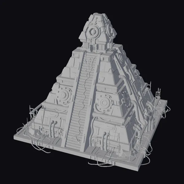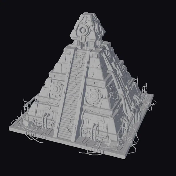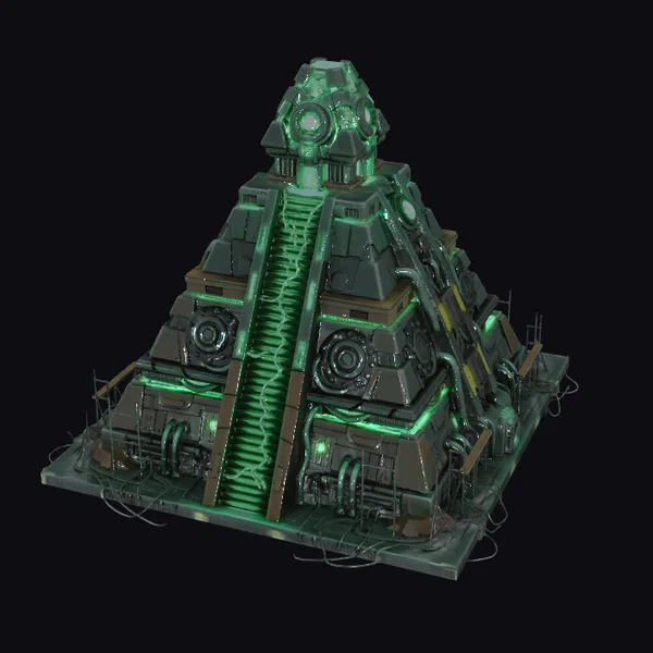 Perched atop a square base, the pyramid’s multi-layered structure is adorned with a variety of details, including spiraling staircases, metallic grates, and what appears to be a series of mechanical eyes or sensors. The entire structure is enveloped in a neon green light that highlights its intricate design, from the textured surfaces to the delicate wiring. This model is perfect for projects requiring a blend of ancient mystique with cyberpunk aesthetics, such as game environments, animations, or architectural designs. Its detailed and ominous presence can add depth and intrigue to any sci-fi setting.