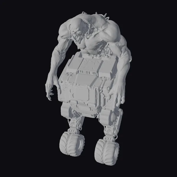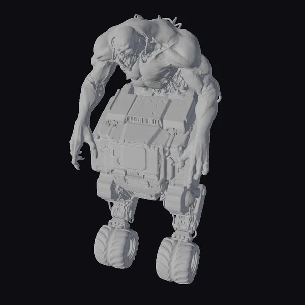This unsettling cyborg creature stands with its massive, muscular body contorted over a bulky blue mechanical torso, as if birthed from the very machinery. The creature’s skin is marred with bloodied wounds and lesions, adding to its terrifying appearance. Its head, a snarling visage with sharp teeth, seems to be pulled down towards the viewer, exuding a sense of aggressive intent. The mechanical lower half, equipped with thick, rugged tires, contrasts starkly with the organic upper body, creating a jarring image of sci-fi terror. The pose, with arms stretched outwards, enhances the creature’s menacing presence. This model is perfect for projects delving into dark sci-fi narratives, horror themes, or cyberpunk worlds, offering a detailed and chilling character that will leave a lasting impact on viewers. Its high level of detail makes it suitable for close-up shots in animations, games, or virtual reality experiences.