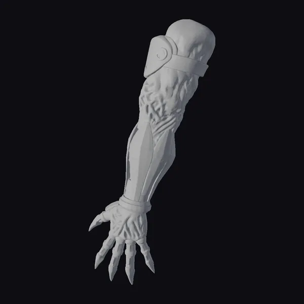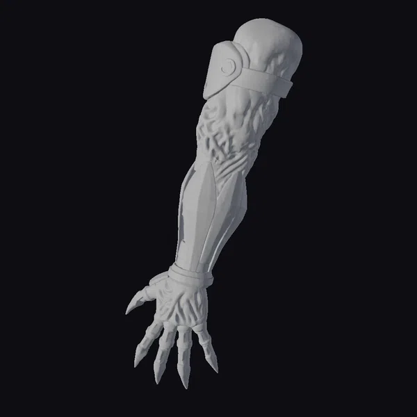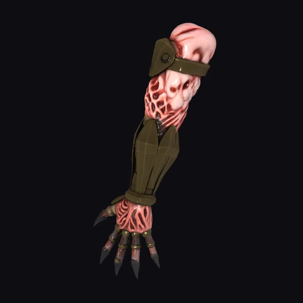 This unsettling cybernetic arm prosthetic features a pink, flesh-like surface with visible red veins and muscle structures, contrasting sharply with its dark brown metallic components. The arm is adorned with a metallic cuff near the elbow and another around the wrist, from which sharp, black claws protrude. The overall design exudes a dark, sci-fi aesthetic, perfect for projects requiring a futuristic, cyberpunk feel. Ideal for use in games, 3D printing, VR/AR experiences, animation, and design projects, this model adds a touch of dystopian horror.