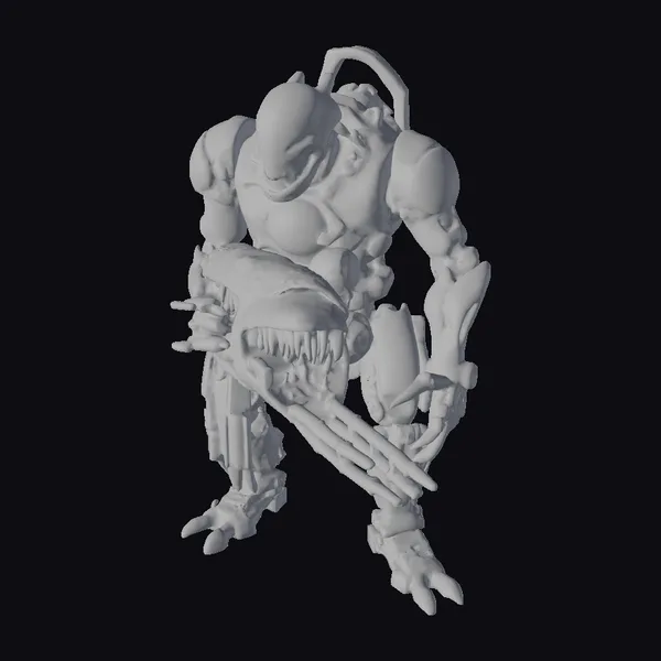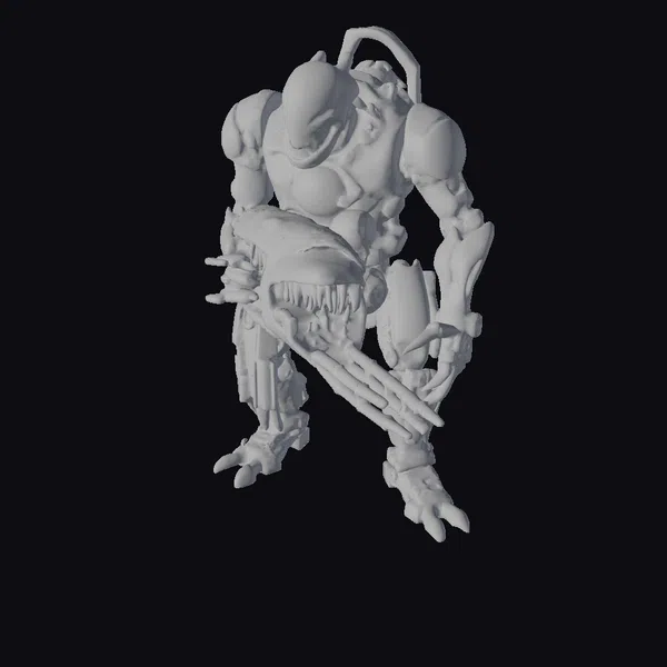 This imposing cybernetic creature stands with a menacing posture, its body a complex amalgamation of mechanical and organic components. The creature’s face is a grotesque parody of life, featuring rows of razor-sharp teeth and piercing yellow eyes that seem to glow with an otherworldly energy. Its body is a mass of metallic limbs, armor plating, and exposed mechanical components, giving it a sense of raw power and technological advancement. The creature’s design suggests a being of immense strength and aggression, perfect for sci-fi games, animations, or designs seeking a futuristic, high-tech aesthetic. Its unique blend of organic and synthetic parts sparks imagination, inviting users to explore the story behind this fearsome entity.