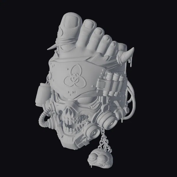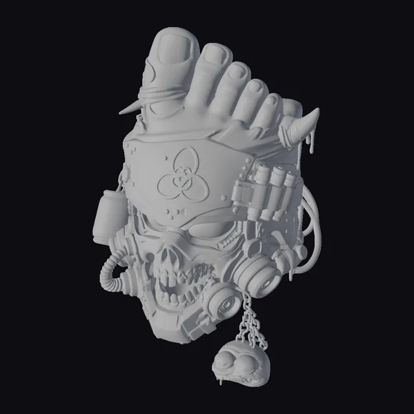 Detailed with precision, this cybernetic skull headgear showcases a fusion of organic and synthetic elements. The metallic structure encases a skeletal face with green glowing eyes, topped with a human foot and adorned with a biohazard symbol on its forehead. A dangling frog-like charm adds to its macabre allure. The model’s industrial style, complete with tubes, wires, and mechanical components, makes it a standout piece. Its unique blend of horror and sci-fi elements renders it perfect for projects requiring a dark, futuristic aesthetic, such as games, animations, or VR/AR experiences.