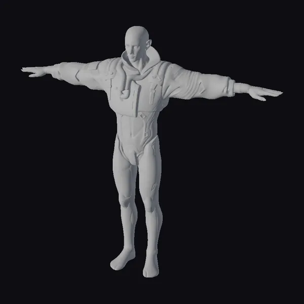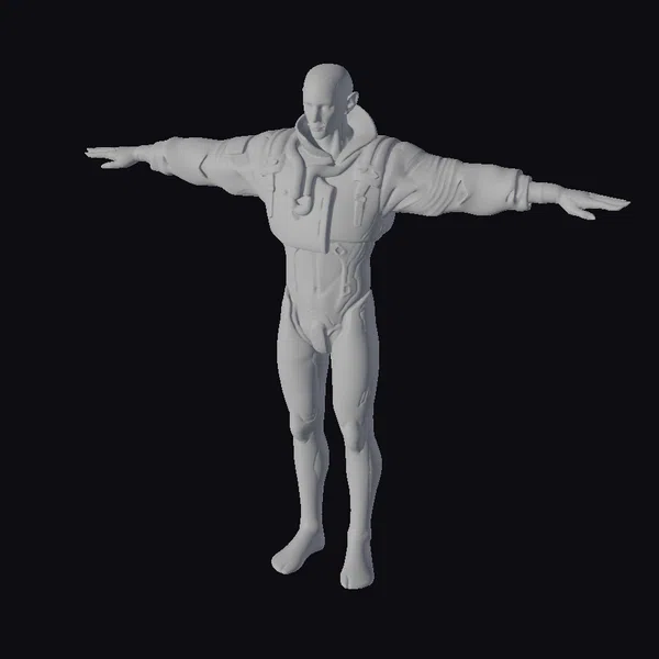 Detailed in every aspect, this cyberpunk alien greeter stands poised with arms outstretched, as if in greeting or defense. Its slender physique is accentuated by a vibrant purple jacket with gray accents, suggesting a blend of style and functionality. The jacket’s design includes cutouts on the elbows and sides, adding to its futuristic appeal. Gray pants complement the upper attire, while the alien’s skin has a striking yellow hue, indicative of its extraterrestrial origin. The character’s face is chiseled, with a subtle, enigmatic expression. This model is perfect for projects requiring a cyberpunk or sci-fi character, such as animations, games, or virtual reality experiences.