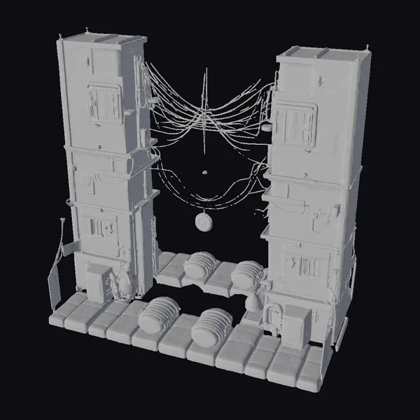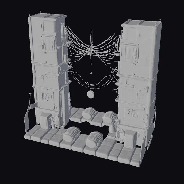 This meticulously crafted 3D model of a cyberpunk alleyway presents a visually stunning environment, perfect for projects requiring a blend of futuristic and gritty elements. The scene is dominated by two towering structures, their surfaces adorned with neon signs that pulse with a soft, pink glow. The alley’s floor is littered with industrial components, while a complex network of wires and cables stretches across the top, punctuated by a solitary, dangling orb. The model’s attention to detail, from the textures of the buildings to the play of light on metal, immerses viewers in a world of high-tech noir. Ideal for use in games, animations, virtual reality experiences, or architectural designs seeking a cyberpunk aesthetic.