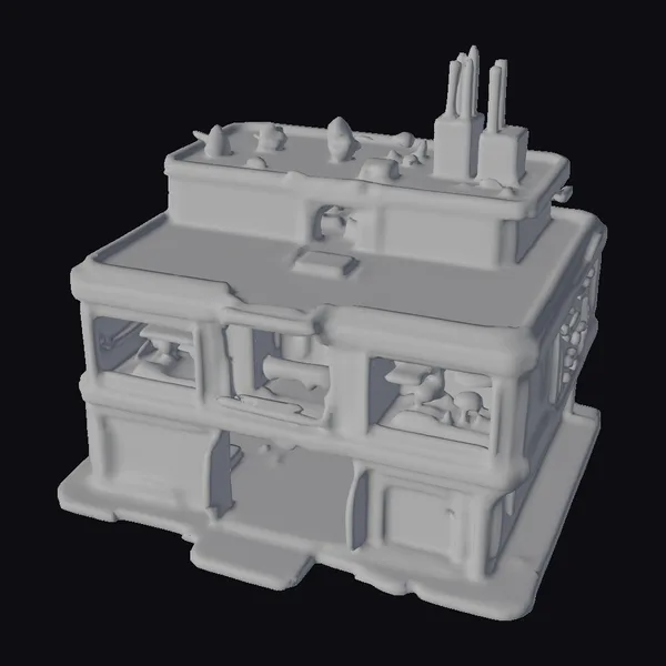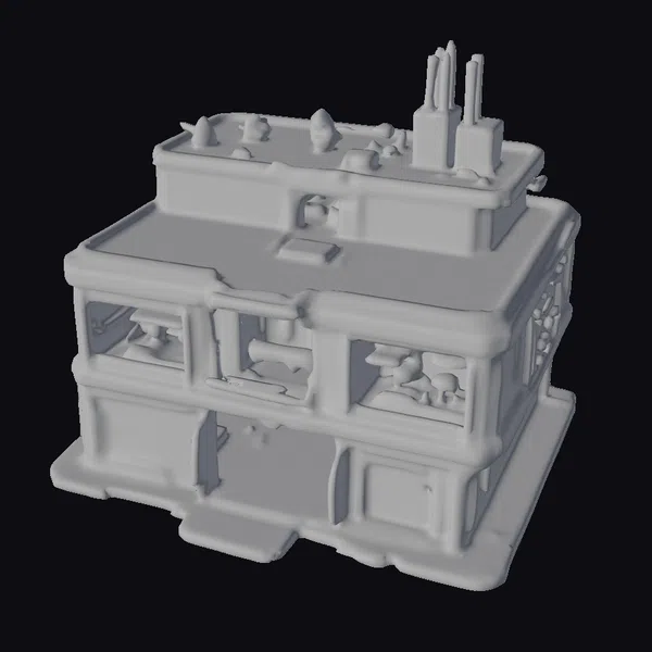 Perched in a dramatic pose, this cyberpunk building facade showcases intricate details and a richly textured surface. The upper level features a series of windows and panels, some of which are ominously lit from within, while the lower level boasts a prominent entrance with stairs leading up to the door. The building’s rugged, industrial appearance is contrasted with bursts of neon light emanating from within, casting a mesmerizing glow across the dark exterior. The model’s complex geometry and realistic rendering make it an ideal choice for games, 3D printing, VR/AR experiences, animation, and architectural design projects seeking a futuristic, high-tech aesthetic.