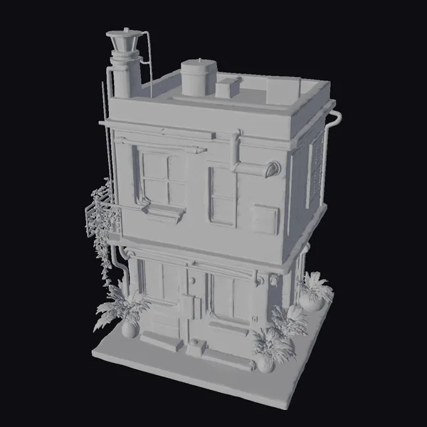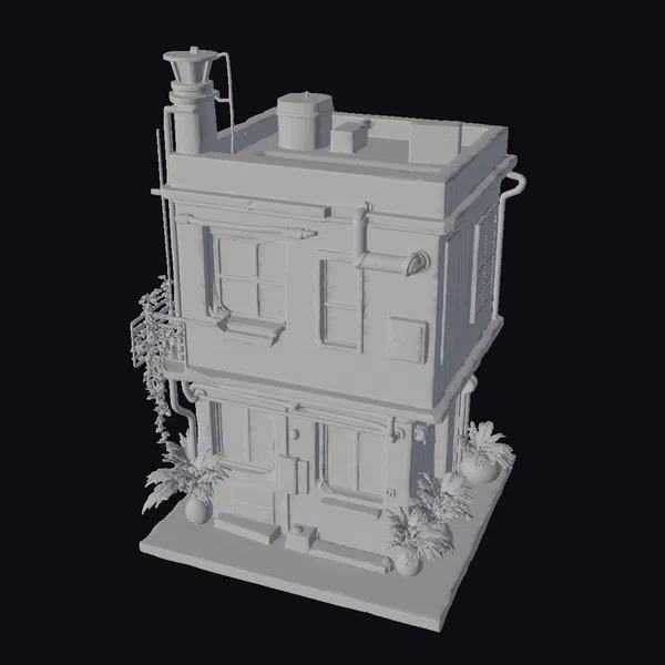 Perched on a gray stone sidewalk, this two-story cyberpunk building appears to be a hub of activity, despite its ramshackle appearance. The upper level features a patchwork of composite panels and corrugated metal, with a smokestack and industrial pipes sprouting from the roof. Glowing pink and orange windows on both levels cast a warm, inviting light, while potted plants add a touch of greenery to the otherwise industrial landscape. As night falls, the building’s vibrant colors and eclectic design make it a beacon of intrigue in a futuristic cityscape. Designers and artists can use this model to create immersive environments for games, animations, or architectural visualizations.