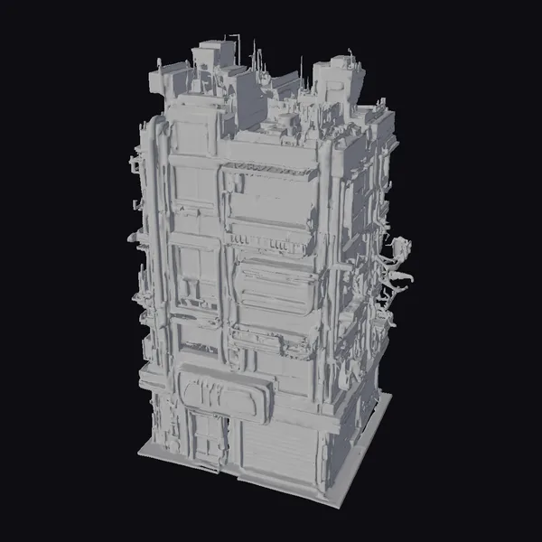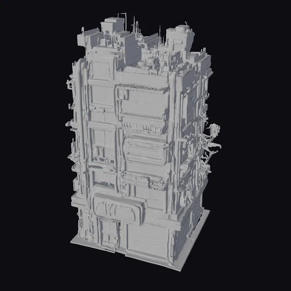 Perched on a stark white background, this intricately detailed city block model showcases a mesmerizing blend of industrial and futuristic elements. The metallic gray surface is punctuated by rows of windows, pipes, and vents, while a vibrant orange sign pulses with energy. As the eye travels upward, it discovers a labyrinthine rooftop landscape of vents, ducts, and mysterious machinery. This model is perfect for adding a touch of dystopian flair to games, animations, or architectural designs. Its versatility makes it suitable for a wide range of applications, from concept art to virtual reality experiences.