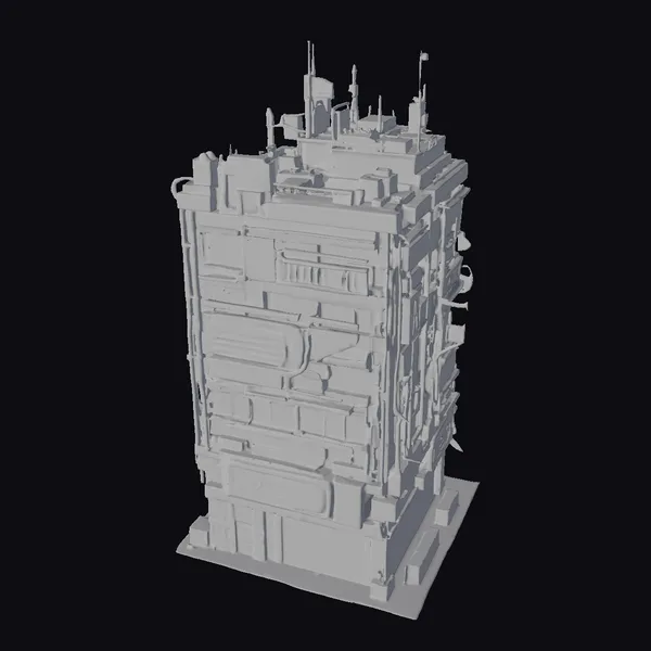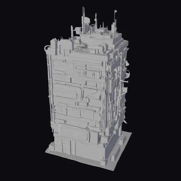 Crafted with meticulous attention to detail, this cyberpunk city building model showcases a complex array of architectural features, from the metallic gray exterior with varied textures to the illuminated windows that suggest a bustling interior. Positioned on a sturdy black base, the model exudes a sense of futuristic urban density. Its design is perfect for enhancing scenes in games, 3D prints, VR/AR experiences, animations, or architectural designs, offering a glimpse into a high-tech urban future.
