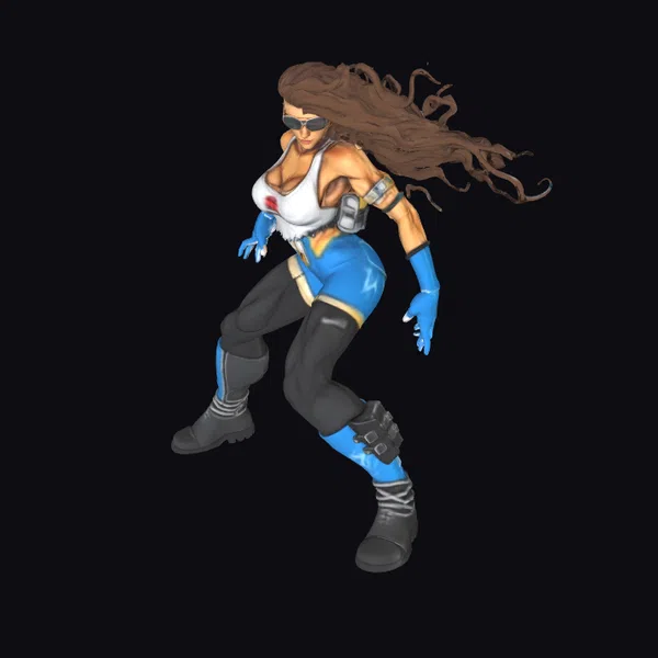 Detailed visual breakdown reveals a cyberpunk female character in a powerful stance, with her right leg forward and arms slightly bent, exuding a sense of readiness. Her long, flowing brown hair flows behind her, complemented by dark sunglasses, a white halter top with a red emblem, and metallic accents on her shoulders. The outfit includes fitted black pants with blue and gold accents, blue gloves, and black boots with blue details. The model’s high-quality textures and lighting highlight its stylized yet detailed appearance. Typical use-cases include integration into sci-fi games, virtual reality experiences, animations, and graphic design projects.