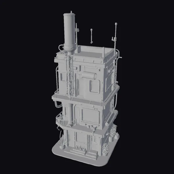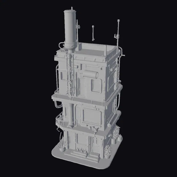 Perched on a flat base, this cyberpunk industrial building rises in a stacked, three-tiered design, each level showcasing a tangle of industrial details. The exterior combines composite panels in muted, industrial hues with corrugated metal accents, giving the structure a utilitarian appearance. Glowing windows in red and blue hues suggest a vibrant, high-tech interior, while a cylindrical pipe rises from the top, flanked by antennae-like protrusions. The building’s facade is a labyrinth of pipes, wires, and conduits, exuding a sense of functional chaos. This model is perfect for adding a touch of gritty futurism to games, animations, or architectural designs.
