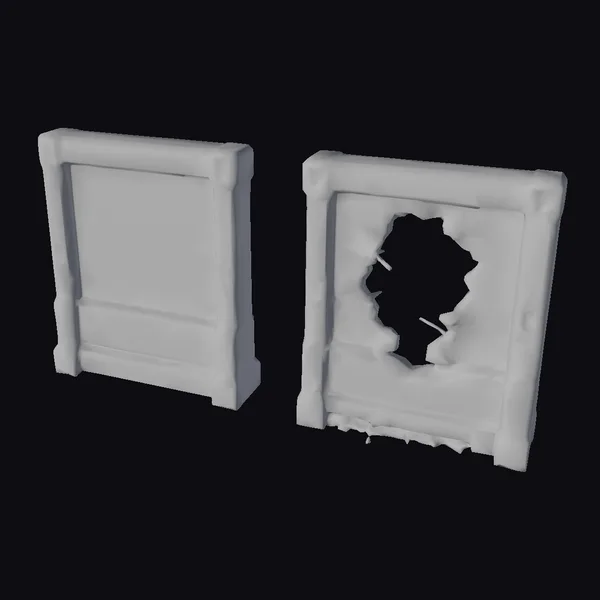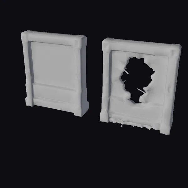Detailed to perfection, these two cyberpunk interior wall sections offer a glimpse into a dystopian future. One panel is intact, with visible vents and a sleek, industrial design, while the other boasts a dramatic hole, complete with jagged edges and rebar. The gray concrete texture and weathering effects add a layer of realism, making these models perfect for games, 3D printing, VR/AR experiences, and architectural visualizations. The contrast between the two panels invites exploration and creativity.
